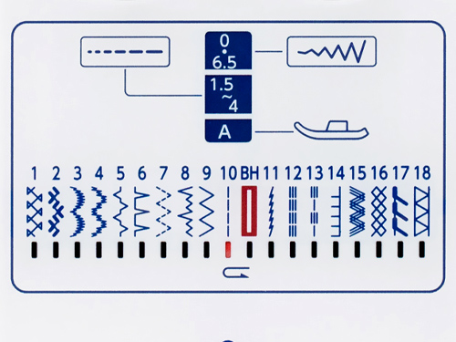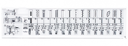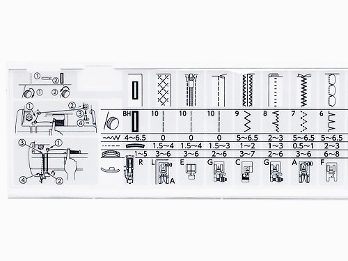 Особенностью данной модели является наличие простого механического "швейного советника" - который наглядно показывает какие значения длины и ширины стежка рекомендованы для выбранной строчки, а также какая необходима лапка. Под крышкой вы также найдете инструкции по настройке с подсказками, какую строчку лучше использовать для определенной швейной операции.