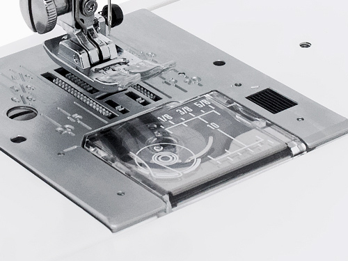В этой швейной машине применен горизонтальный челнок двойного обегания. Под прозрачной крышкой прекрасно видно количество нити оставшейся на шпульке. Машины оснащенные челноком двойного обегания меньше вибрируют и в челноке значительно реже запутывается нижняя нить. Горизонтальный челнок не требует смазки.