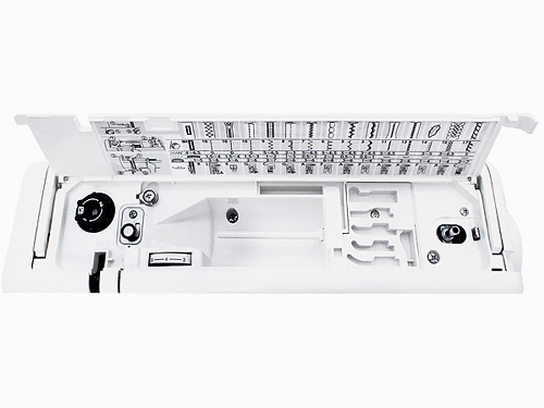 Под верхней крышкой вы найдете специальные ячейки, предназначенные для аккуратного хранения лапок и некоторых швейных принадлежностей. Все остальное вы можете хранить в отсеке для аксессуаров в съемной платформе.